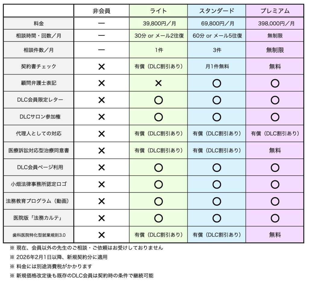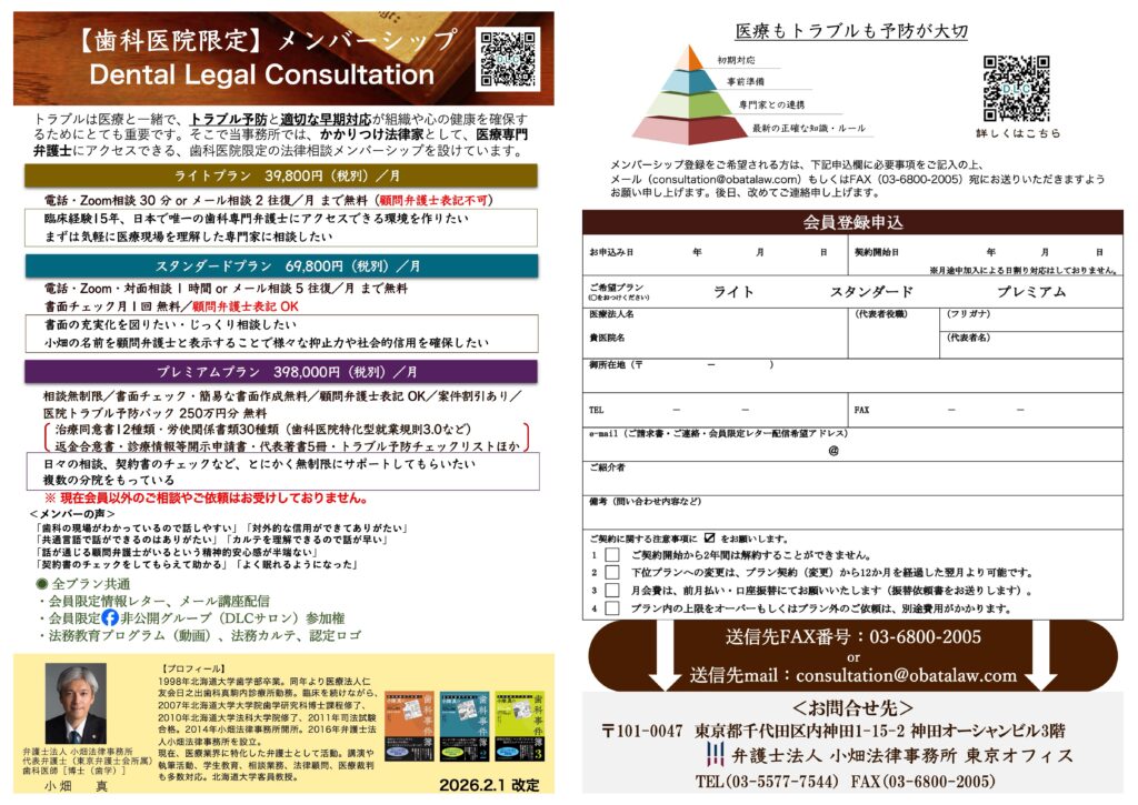 そこで当事務所では、歯科医院限定で、当法人代表小畑真とチームを組むことができる月額39,800円(税別)〜のメンバーシップ<Dental Legal Consultation>を提供しております。